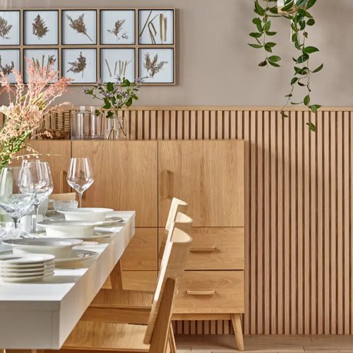Linerio panels come in three styles, each with different slat widths and depths. They are available in three shades: Natural, Mocca, and Chocolate. Made from polystyrene with a hot stamp print, these panels are lightweight, durable, and 100% recyclable. They are easy to clean and can be installed in busy areas like hallways, workspaces, and kitchens.
