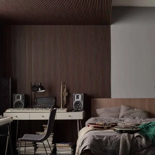 Linerio panels come in three styles, each with different slat widths and depths. They are available in three shades: Natural, Mocca, and Chocolate. Made from polystyrene with a hot stamp print, these panels are lightweight, durable, and 100% recyclable. They are easy to clean and can be installed in busy areas like hallways, workspaces, and kitchens.